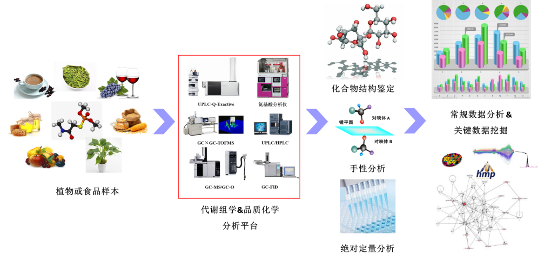 儀器設(shè)備:GC×GC-TOFMS、GC-MS、GC-O/MS、GC-FID、UPLC-Q-Exactive、UPLC-Q-TOFMS、UPLC-TQS-micro、UPLC、HPLC、氨基酸分析儀等。