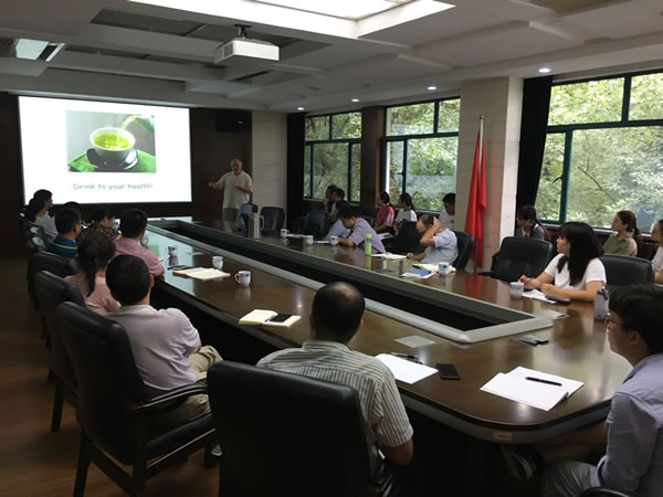 Hackman教授為我所科研人員和研究生作了題為《茶葉營(yíng)養(yǎng)研究現(xiàn)狀及挑戰(zhàn)》的學(xué)術(shù)報(bào)告。在報(bào)告中,他詳細(xì)介紹了來自茶葉中的兒茶素等多酚類物質(zhì)的主要功能及其藥理價(jià)值,并就兒茶素在動(dòng)物和人中可能存在不同代謝方式等方面的研究成果與我所科研人員進(jìn)行了現(xiàn)場(chǎng)交流。