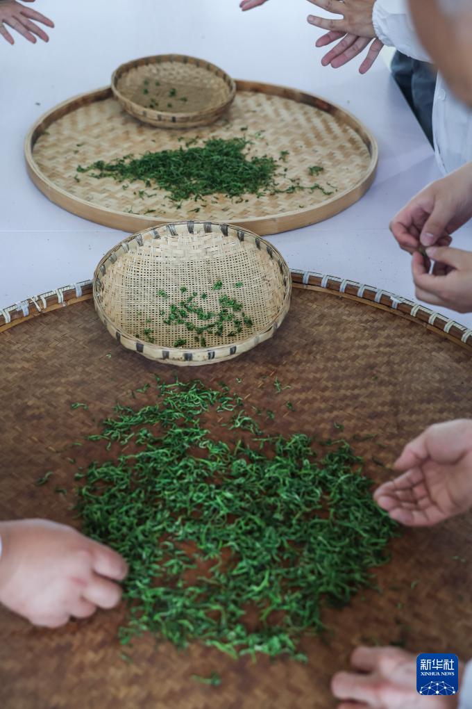 4月8日,在浙江杭州富陽區(qū)里山鎮(zhèn)安頂村共富工坊內(nèi),茶農(nóng)在查看剛剛采收下來的安頂云霧茶鮮葉。新華社記者 徐昱 攝