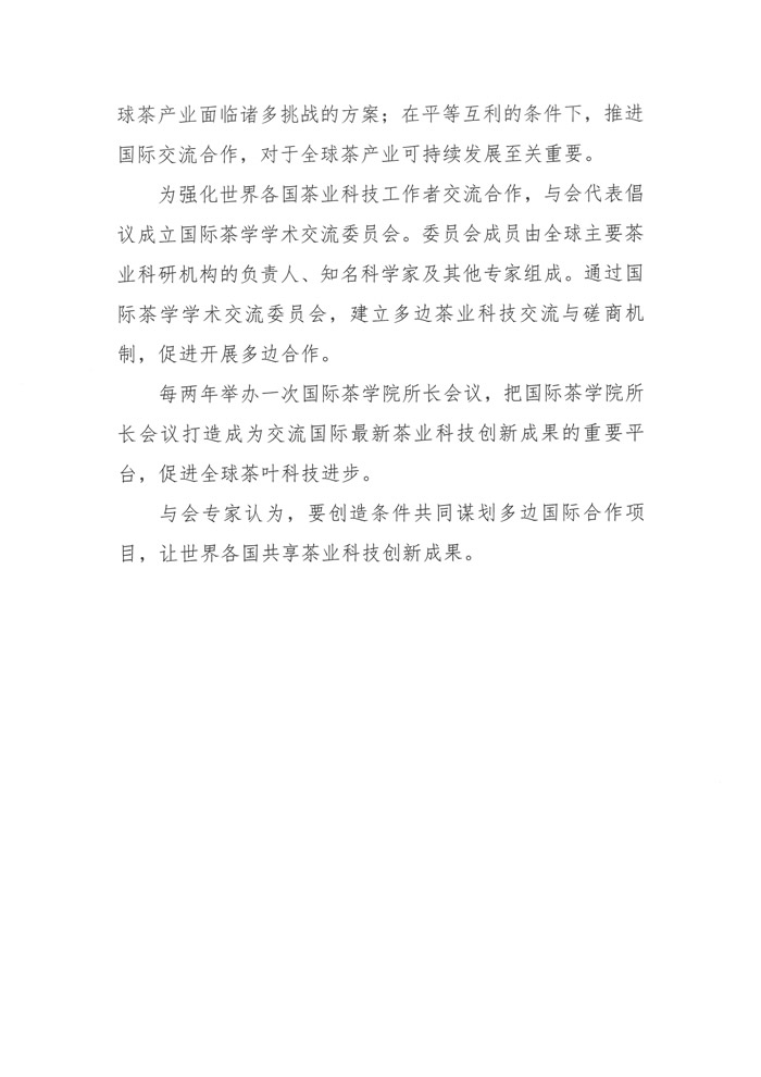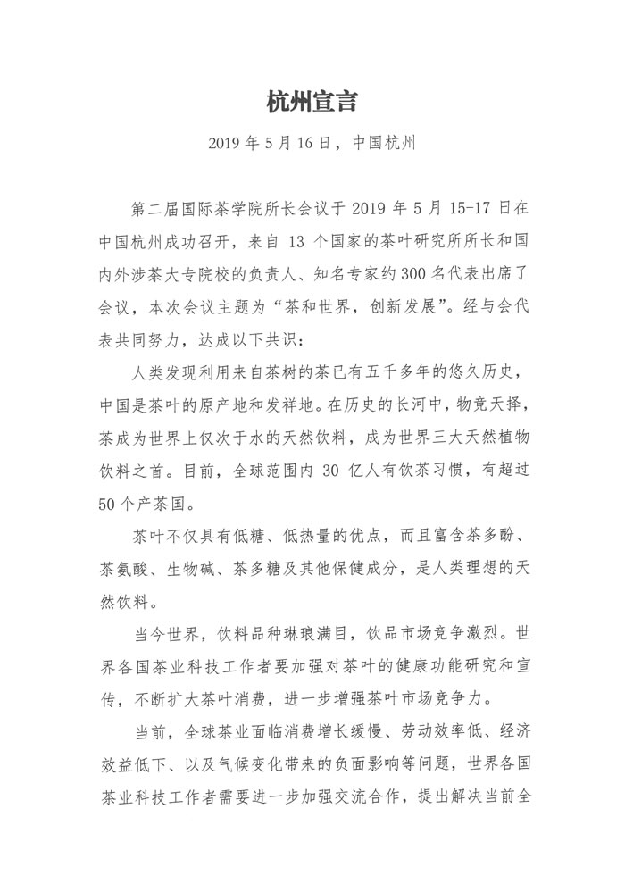 來自13個國家的茶葉研究所所長達成共識,形成并發布了《杭州宣言》。各國茶葉科技工作者要加強對茶葉的健康功能研究和宣傳,不斷擴大茶葉消費,進一步增強茶葉市場競爭力。同時,要進一步加強交流合作,建立多邊茶業科技交流與磋商機制,共同謀劃國際合作項目,提出解決當前全球茶產業面臨諸多挑戰的方案。商定今后每兩年舉辦一次國際茶學院所長會議,把國際茶學院所長會議打造成為交流國際最新茶業科技創新成果的重要平臺,促進全球茶葉科技進步。