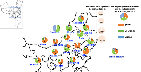 茶樹是喜酸作物,其最適宜的土壤pH值為4.5-5.5,但在強酸性土壤環境(土壤pH<4.5)下,茶樹養分吸收受到限制,影響茶樹生長和茶葉品質,同時茶樹對鉛等重金屬元素吸收量顯著提高,從而造成安全隱患。因此,掌握我國茶園土壤酸化現狀,可為未來我國茶園土壤酸化分類調控對策的制訂和重點區域土壤酸化的阻控提供依據。