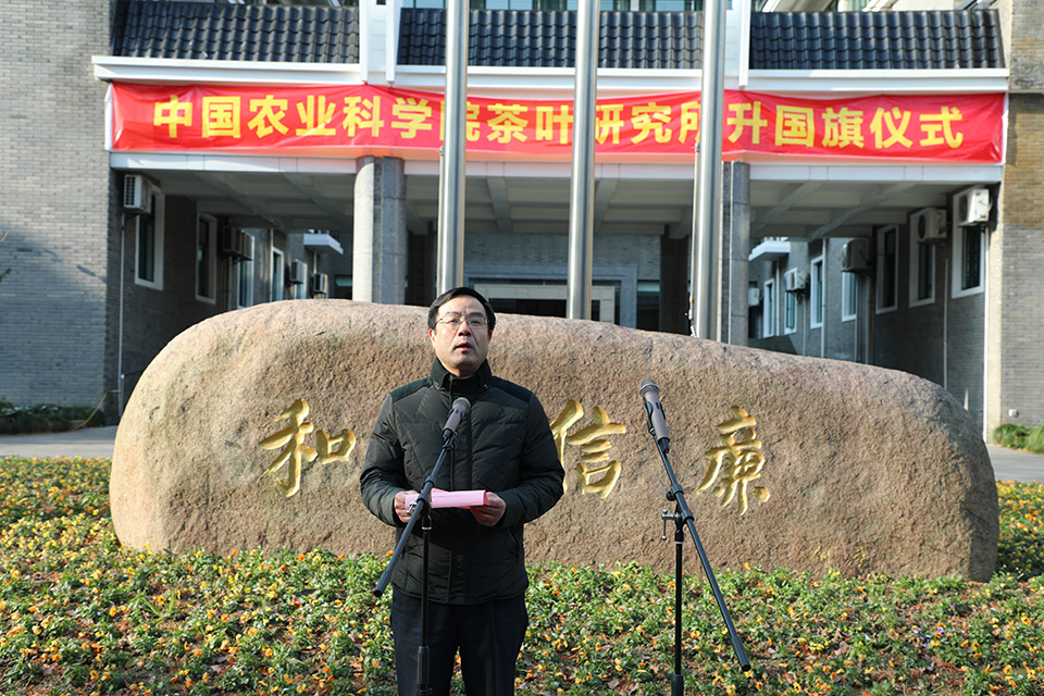 儀式后,姜仁華所長、書記作了講話。他指出,即將過去的2020年,是中華民族歷史上極不平凡的一年。以習(xí)近平同志為核心的黨中央不忘初心、牢記使命,團(tuán)結(jié)帶領(lǐng)全黨全國各族人民砥礪前行、開拓創(chuàng)新,在這極不尋常的年份交出了一份人民滿意、世界矚目、可以載入史冊(cè)的優(yōu)秀答卷。他表示,國旗是國家的象征和標(biāo)志,舉行升掛國旗儀式,就是要大力弘揚(yáng)愛國主義精神,讓愛黨、愛國、愛人民成為每一個(gè)茶科人的堅(jiān)定信念和精神追求;就是要大力弘揚(yáng)科學(xué)家精神、勞動(dòng)精神、勞模精神、工匠精神,以科學(xué)、嚴(yán)謹(jǐn)、務(wù)實(shí)的工作作風(fēng),共創(chuàng)茶葉所更加美好的明天。最后,他勉勵(lì)全所職工,在新的一年里,以勇于擔(dān)當(dāng)、奮發(fā)有為的精神狀態(tài),開拓創(chuàng)新、腳踏實(shí)地的工作作風(fēng),共同譜寫研究所發(fā)展新的篇章,以更加優(yōu)異的成績(jī)向建黨100周年獻(xiàn)禮。