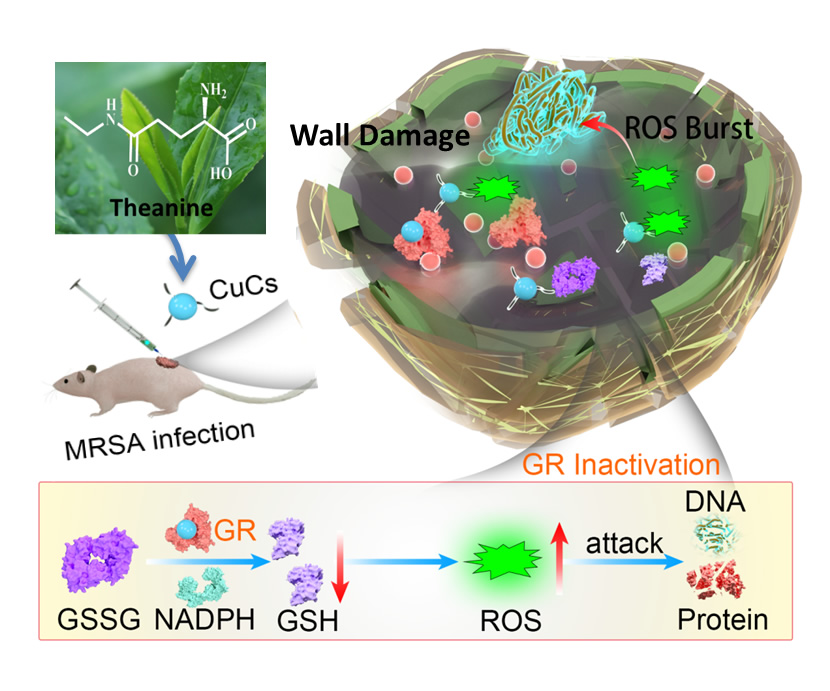 通過進一步對其抗菌機制解析,發現茶氨酸多肽銅團簇不僅可以破壞細菌壁膜結構,使其內容物泄露;而且抑制谷胱甘肽還原酶(GR)的活性,導致活性氧(ROS)爆發,過載的ROS不僅能夠攻擊生物大分子,還能夠加速細菌壁膜結構的破壞,最終導致細菌死亡。這項工作提出并初步證明了“金屬團簇可以通過直接抑制細菌內GR活性來導致ROS升高,最終導致細菌死亡”這一假說。