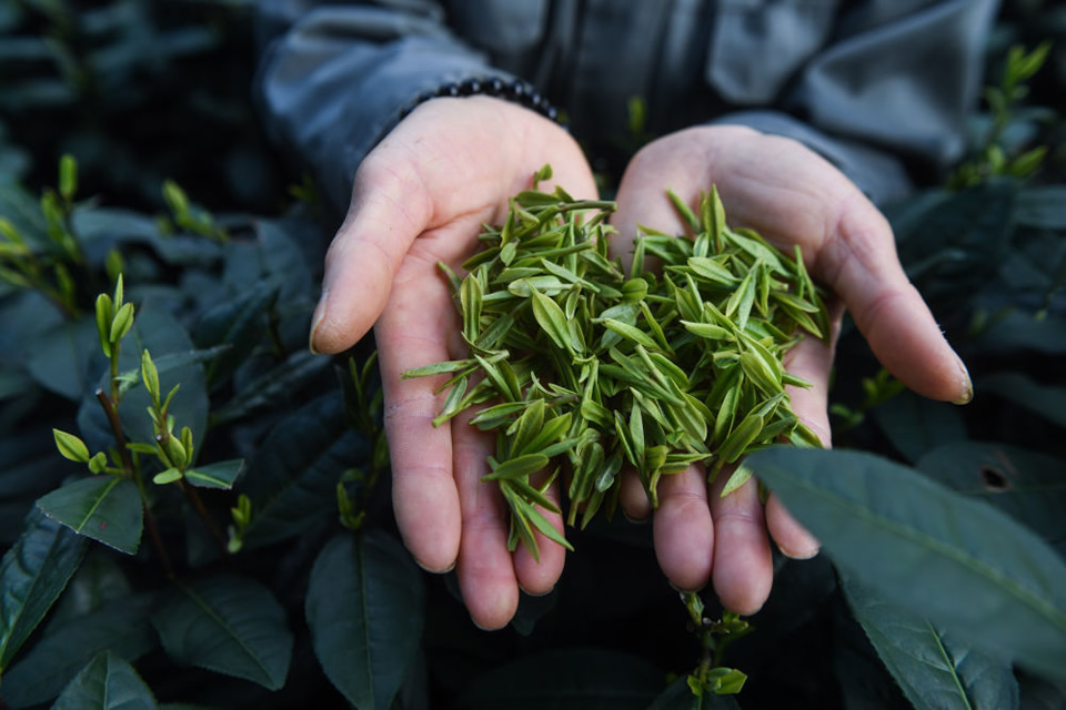 3月12日,在位于杭州市西湖風景名勝區滿覺隴村白鶴峰的西湖龍井茶葉基地,茶農展示剛剛采摘的西湖龍井茶鮮葉。新華社記者徐昱 攝