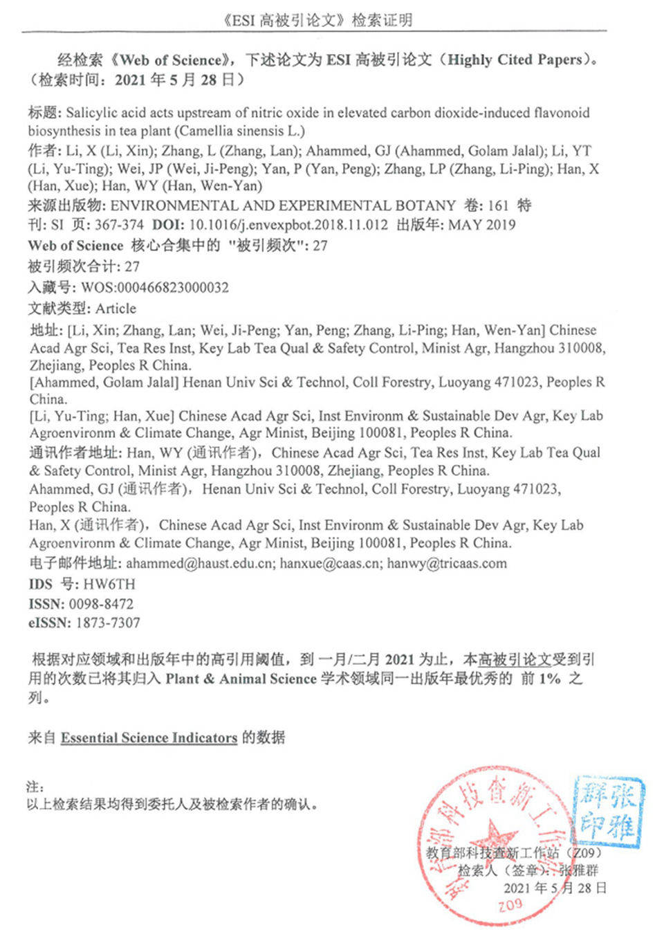 “Salicylic acid acts upstream of nitric oxide in elevated carbon dioxide-induced flavonoid biosynthesis in tea plant(Camellia sinensis L.)”,自2019年在Environmental and Experimental Botany上發表至今,被引用次數已達27次(Web of Science數據統計)。韓文炎研究員為該論文的通訊作者。論文揭示了水楊酸和一氧化氮信號參與了二氧化碳濃度升高環境下茶樹類黃酮代謝的調控,為氣候變化環境下茶樹品質代謝調控提供了理論依據。