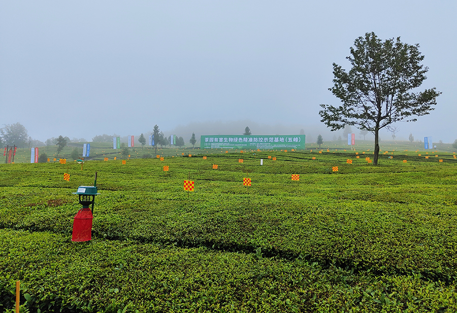 30日上午,與會代表來到五峰道家灣茶園有害生物綠色精準防控示范基地現場觀摩學習。技術示范茶園內整齊布置著茶樹害蟲性誘捕器、天敵友好型殺蟲燈、黃紅雙色誘蟲板等裝置,結合高效安全生物農藥,園內害蟲被有效防治,茶樹長勢喜人。