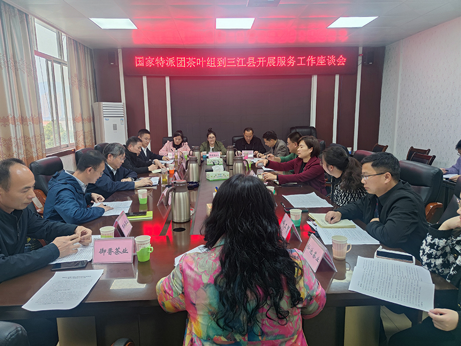 實地調研后,江用文書記一行參加了縣政府組織的座談會,確定茶樹新品種引進示范、茶園害蟲綠色防控、茶葉標準化加工、技術培訓等6項科技幫扶任務,并明確了任務分工和進度安排。江用文書記表示,三江縣生態環境優、茶產業基礎好,國家科技特派團茶葉產業組將發揮人才、科技優勢,為三江縣提供科技支撐,助推三江縣茶產業高質量發展。吳明煥副縣長對專家組高效開展科技幫扶,有力促進三江茶產業發展表示感謝,并表示今后將為專家組工作開展提供保障。